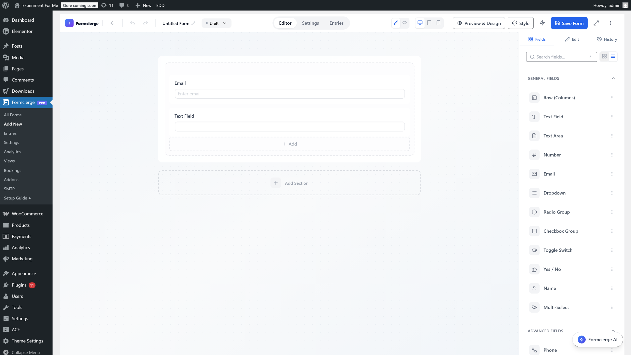 At the very top-left of the top bar is the **form name** field — it starts as *Untitled Form*. Click it and type a descriptive name like *Contact Us* or *Booking Request*. This name is used in the Formcierge admin dashboard and in notification emails, but it is **not** shown on the public form unless you add a Heading field manually.