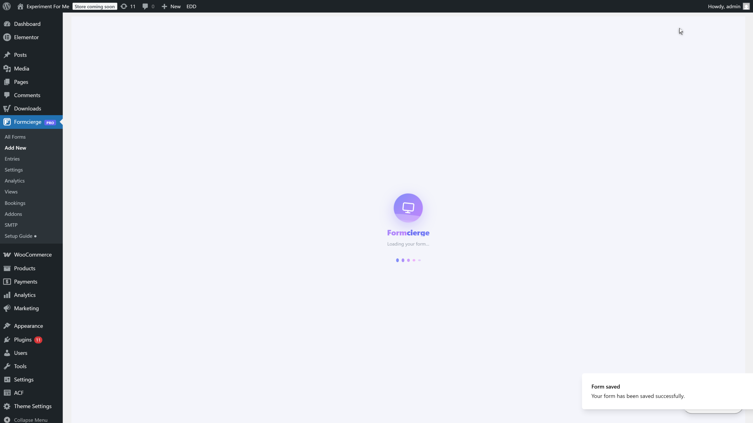Look at the browser address bar — the URL now contains `&form_id=5` (or whatever ID was assigned). This ID is how WordPress identifies your form internally, and it is the same number that appears in the shortcode `[formcierge id="5"]`. Bookmark this URL if you want to return directly to this form's editor later.