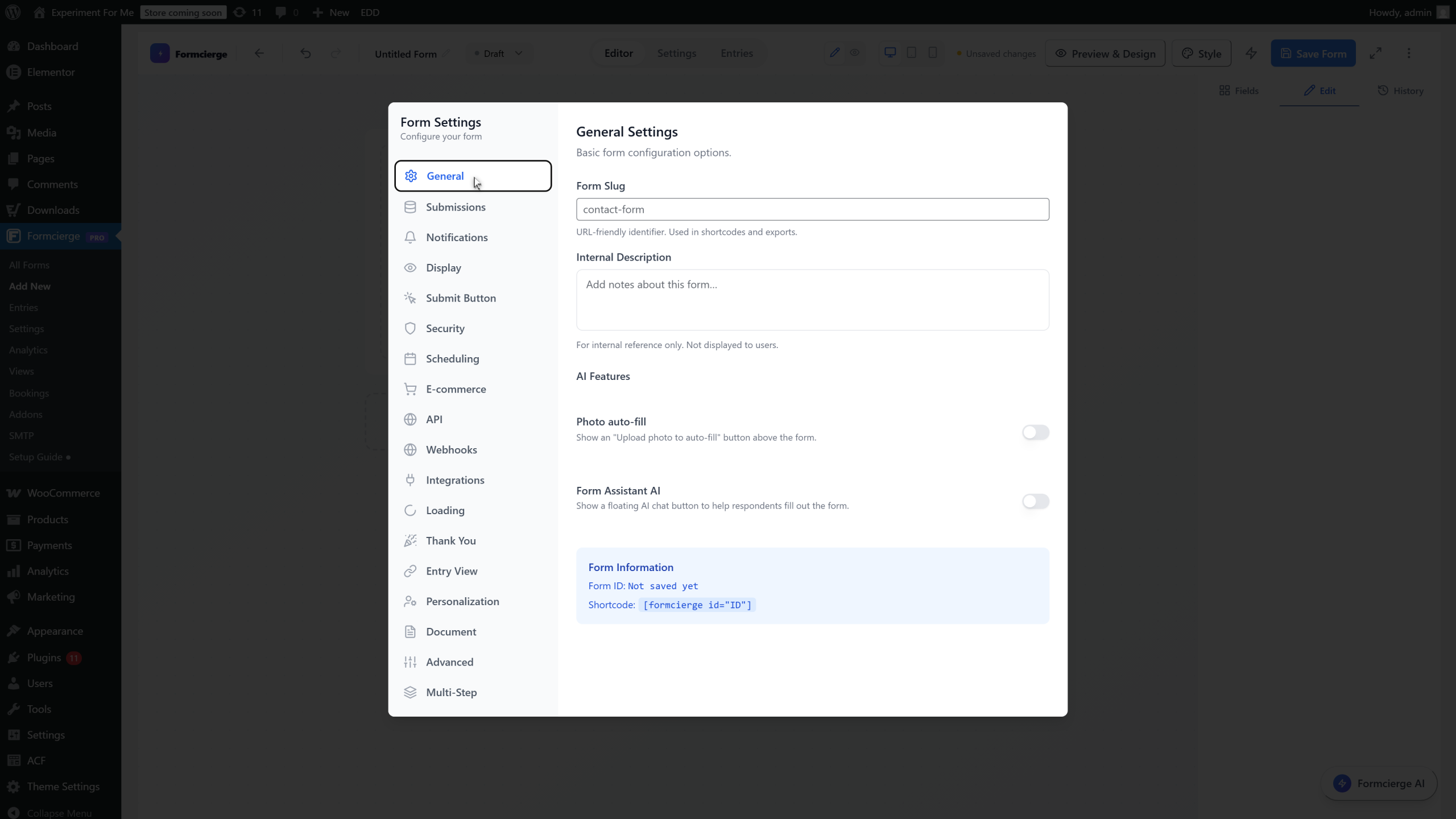 The **General** tab shows the shortcode in the format `[formcierge id="X"]`. This shortcode is permanent — it will never change even if you rename the form or move it to a different page. Write it down or copy it to your clipboard now.